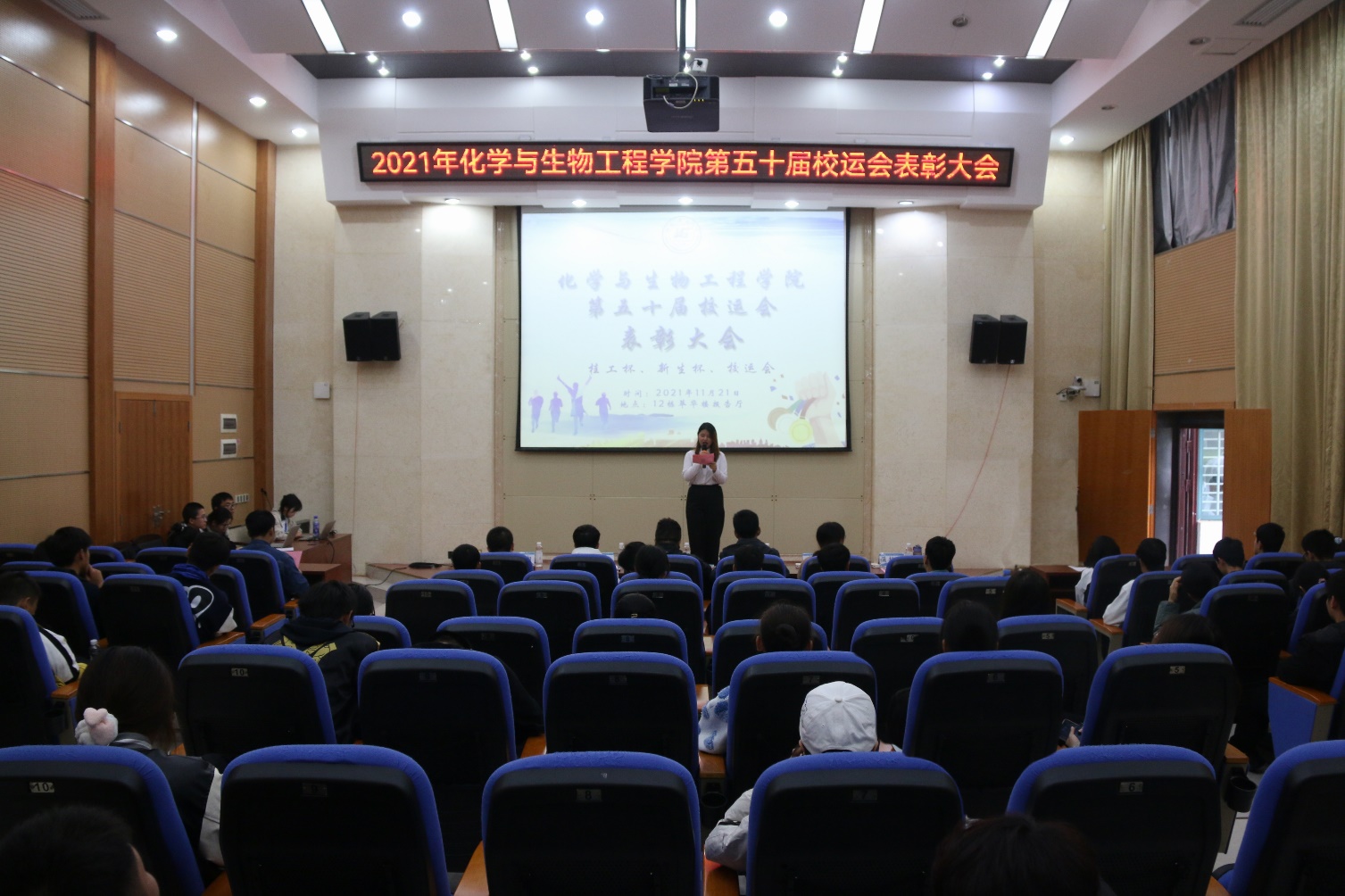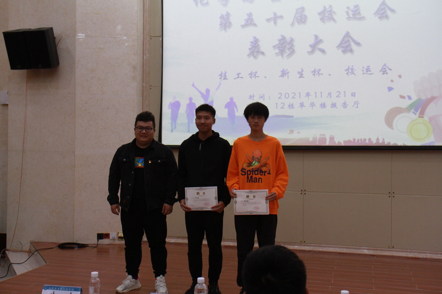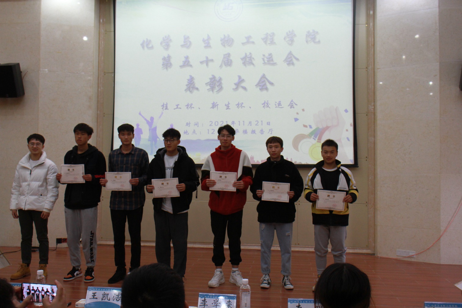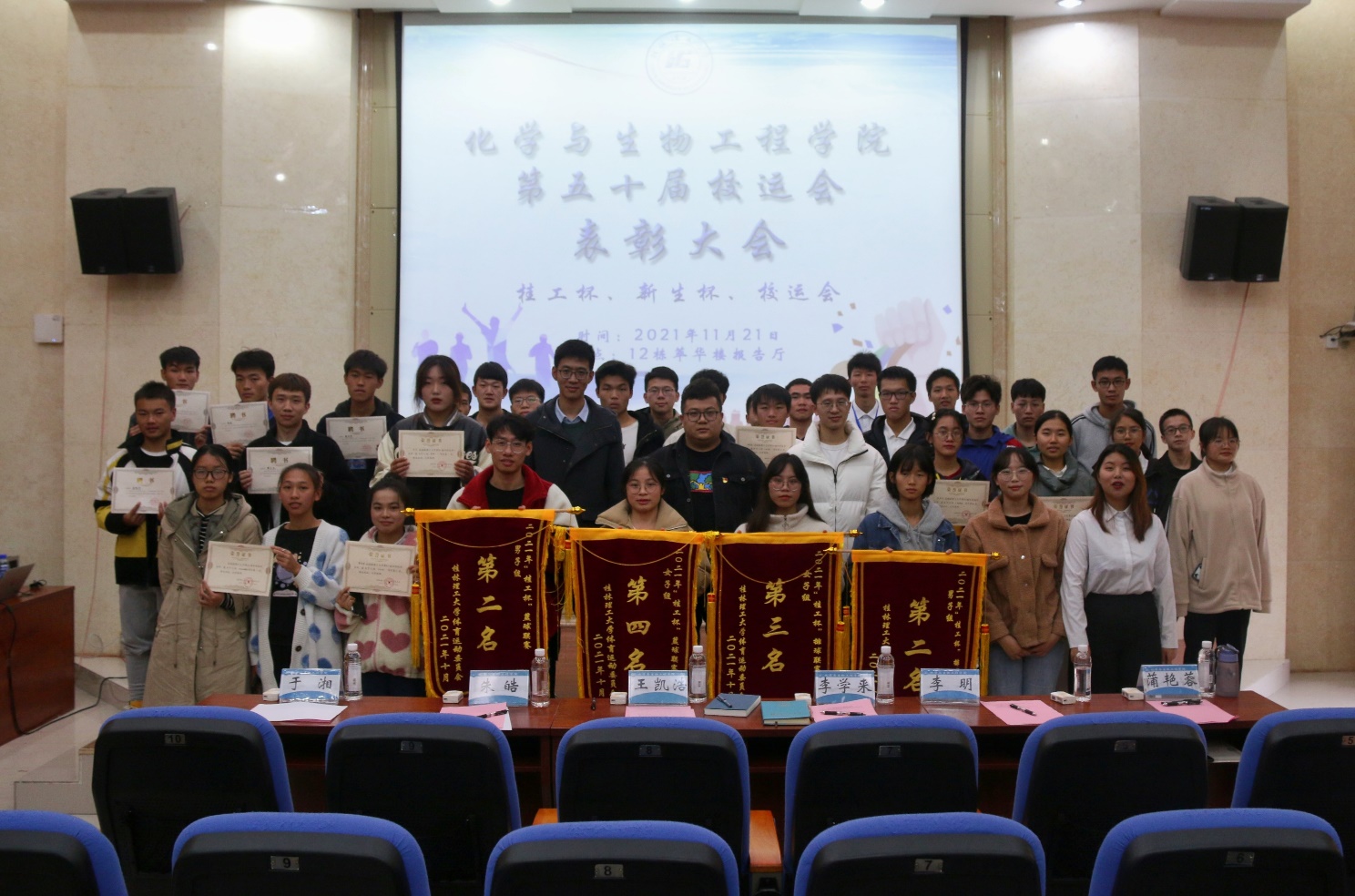 在雁山校区12栋萃华楼报告厅举行了第五十届校运会表彰大会,学院团委副书记王凯浩、学院19级辅导员朱皓、学院21级辅导员李学来老师出席会议,全体参赛运动员参加此次表彰大会。