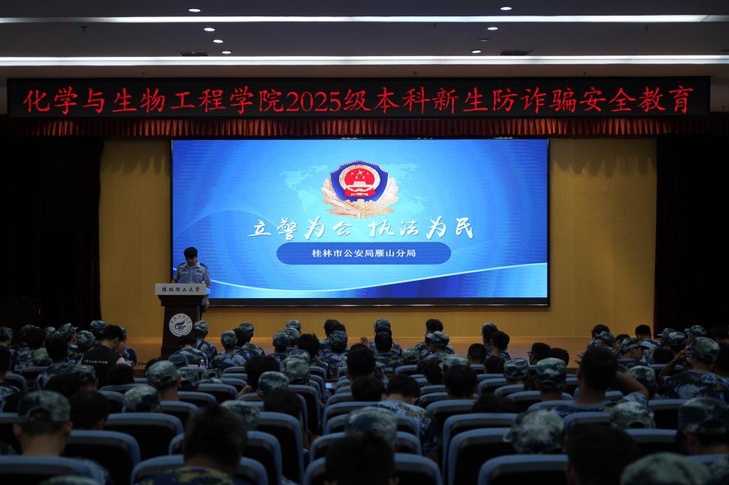 在雁山校区图书馆报告厅隆重举行新生启航教育之防诈骗安全教育专题讲座。本次讲座特邀桂林市公安局雁山分局卢警官担任主讲。