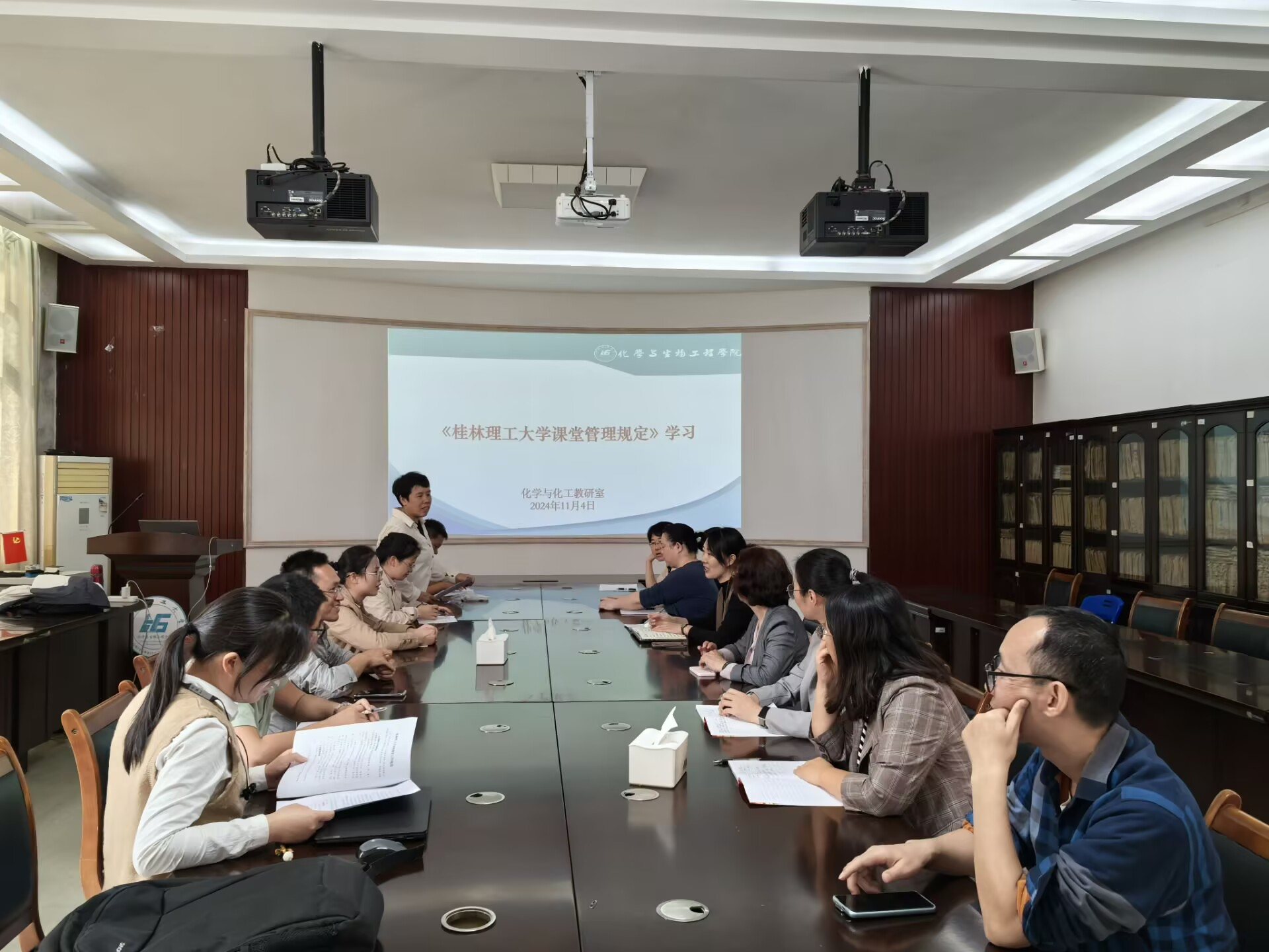 根据学校《关于开展2024年度“教学质量月”活动的通知》通知要求,2024年11月4日上午,化学化工教研室组织全体专业教师在雁山校区12217集中学习了《本科教学工作规范》、《课堂管理规定》《实习工作管理规定》等教学管理规章制度,并线上随机进入课堂,对相关实施细则进行充分的强调。