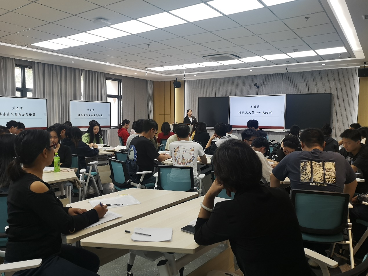 张会香老师从灭菌方法、优缺点、灭菌原理、需要解决的工程问题、影响因素等方面讲授了《培养基灭菌与空气灭菌》的内容,并指导学生进行了问题思考与讨论。课堂上,张老师运用大量的实例对知识点进行生动的讲解,强调重点,解答难点,积极调动学生们的学习热情,同时将“灭菌”与“碳达峰”、“碳中和”相结合,传达节能减排的理念,学习效果优良。随后,参加观摩活动的各位老师从课堂教学设计、教学内容、教学方法等方面的与授课教师进行了深入地交流与探讨。本次公开课观摩活动,为教师们提供了一次珍贵的交流、学习和提高的机会。