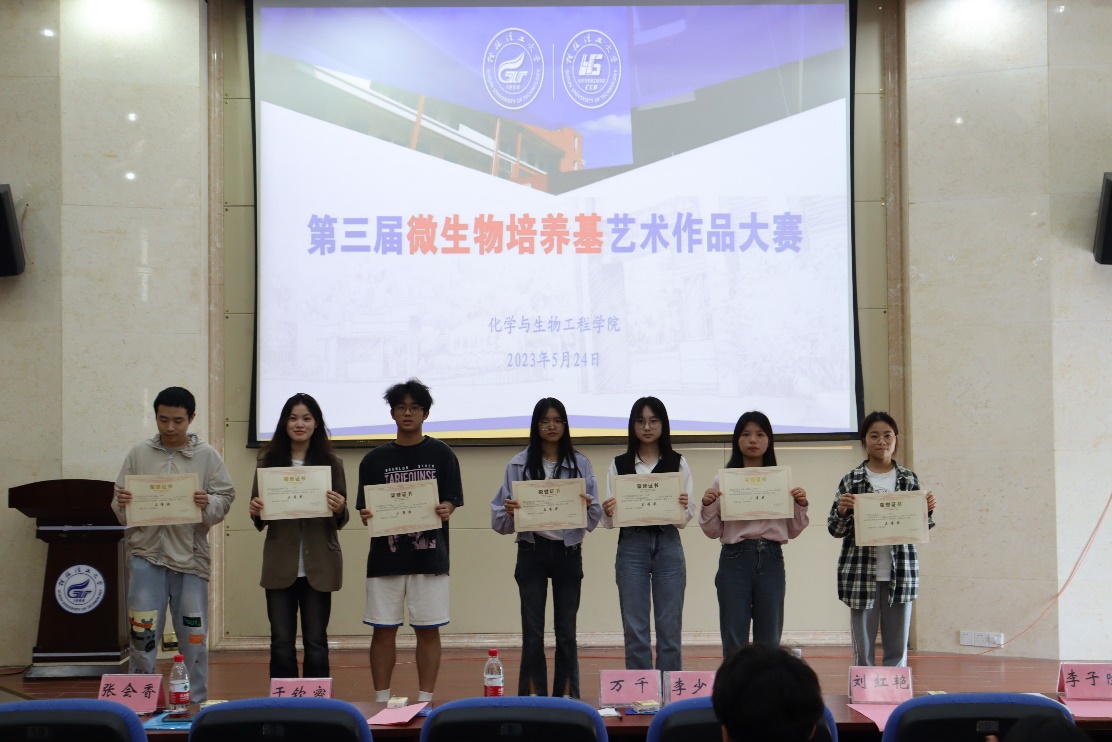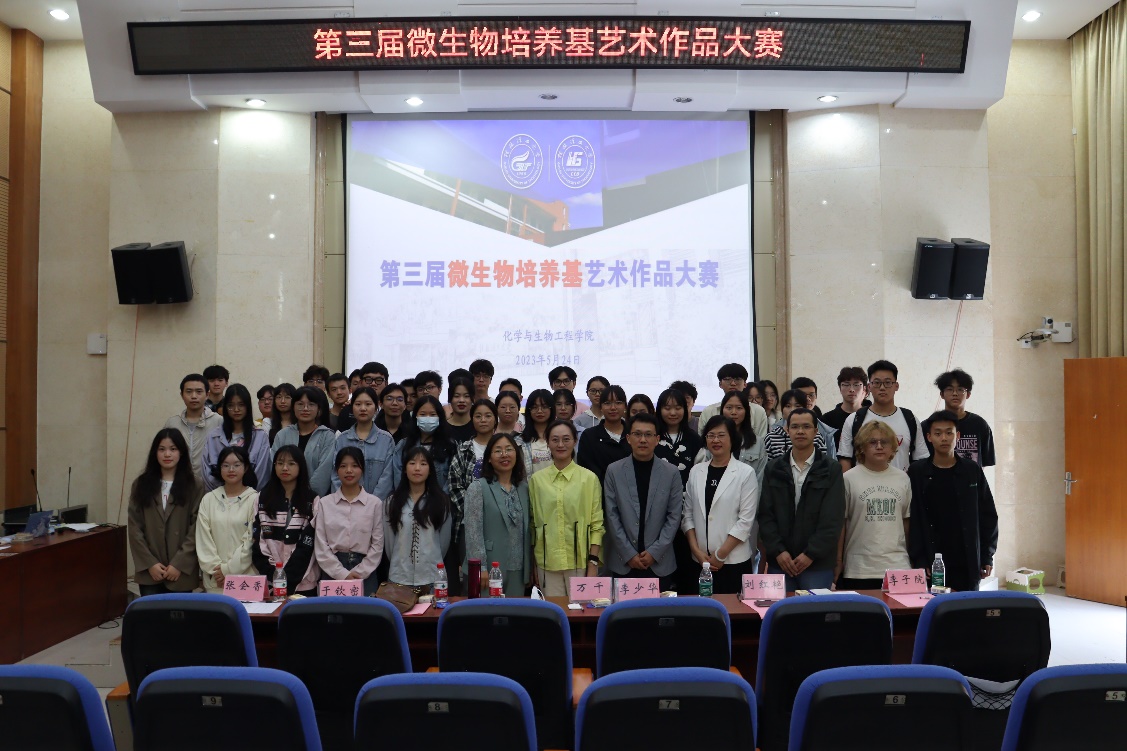 为了普及微生物科学知识,展示多姿多彩的微生物世界,将艺术与微生物相结合,提升学生的美育能力,加强学生创新实践能力的培养。生物工程专业于2023年5月24日在我校雁山校区萃华楼报告厅成功举办了第三届微生物培养基艺术作品大赛。本次比赛于5月19日开始进行了为期5天的线上评选活动,共获得8千余张选票。5月24日现场比赛中邀请了人文素质教育教学部万千副主任、艺术学院视觉传达设计教研室主任于钦密副教授、化生学院李少华副书记和生物工程教研室刘红艳教授、李子院高级实验师担任评委。本次比赛共有全校6个学院12个专业上百人参赛,经过万千副主任前期对同学们作品设计的指导,各参赛团队经过一个月的精心准备,最后共提交了24组作品参加比赛。
