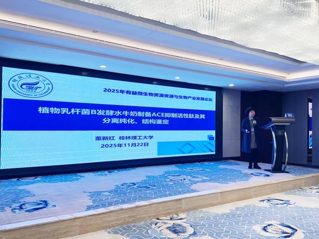 会上,董新红教授作《植物乳杆菌发酵水牛奶制备ACE抑制活性肽及其结构研究》分会报告,展示团队在功能活性肽开发领域的研究成果。李静副研究员作《五指毛桃内生菌分离筛选与活性研究》报告,介绍团队在特色资源微生物挖掘与活性利用方向的工作。两位研究生在研究生论坛进行学术汇报,体现了工口漫画