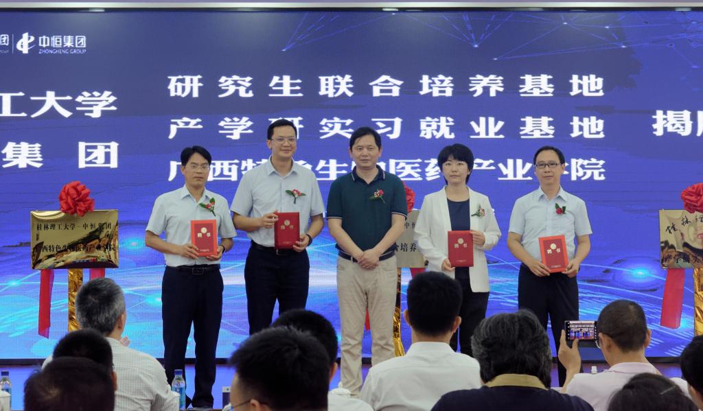 的到访表示热烈欢迎,并对双方开展的深度合作表示由衷期待。他表示,中恒集团与学校合作的初心不变,希望与学校在人才培养、产学研融合、实习就业等方面进行深度合作。随后,集团代表与学校代表共同上台,为研究生联合培养基地、产学研实习就业基地、广西特色生物医药产业学院揭牌。揭牌仪式后,方亮院长为企业导师颁发中恒集团研究生导师聘书。