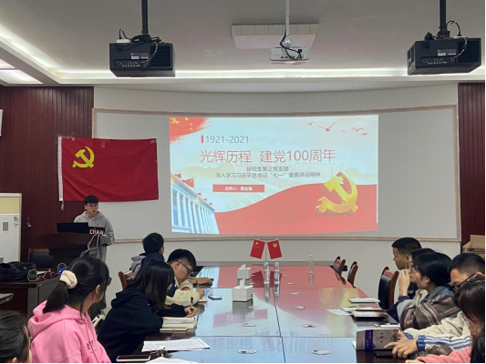 牢记初心使命,赓续精神血脉。为深入学习贯彻落实习近平总书记“七一”重要讲话精神,鼓励支部成员牢记党的初心使命,11月16日晚,学院研究生第三党支部于萃华楼12217会议室开展了深入学习习近平总书记“七一”重要讲话精神专题党课。党课由支部副书记黄金福同志主持,支部全体党员同志参加。