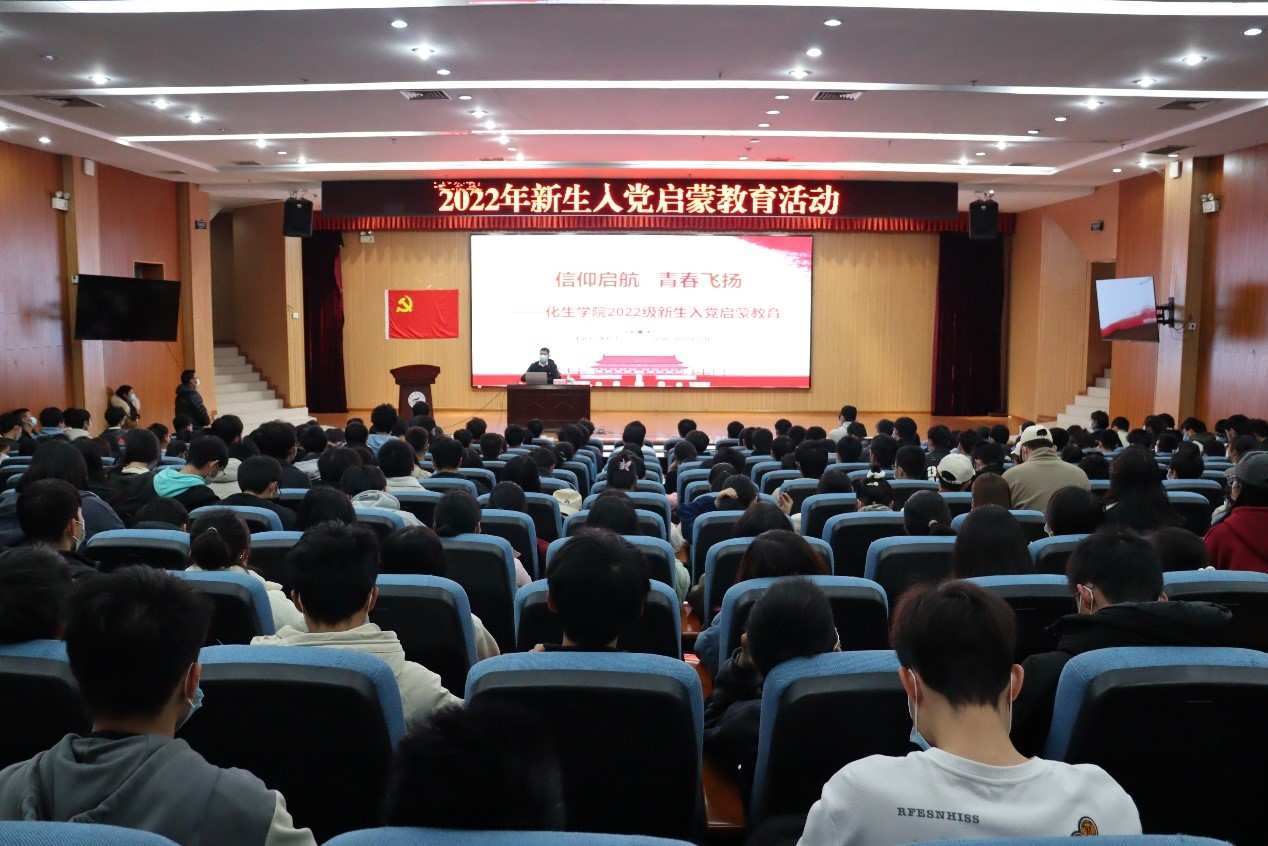 为加强学院2022级新生对中国共产党的认识,提高思想觉悟,端正入党动机,激发入党积极性和学习习近平新时代中国特色社会主义思想,12月9日中午在雁山校区图书馆报告厅,学院党委彭代江书记为2022级新生做“信仰启航,青春飞扬”为主题的入党启蒙专题党课,2022级全体新生参加本次党课。本次党课由党委副书记李少华老师主持。