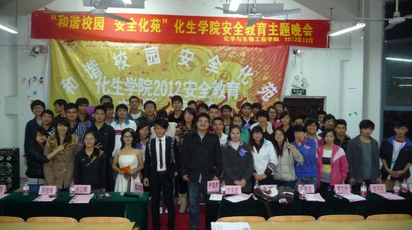 为了响应学校冬季学生安全教育月的文件精神,加强同学们的安全意识,化生学院于12月14日晚在04110教室举办2012安全教育主题晚会。出席本次晚会的嘉宾有院团委书记周德海老师、10级辅导杨晓老师以及12级辅导何宗辉老师。化生学院三百多名学生参加了晚会。