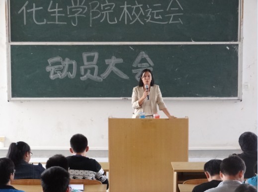 精神,力争上游,永不言败。最后,陶副书记发言,她说道,一年一度的运动会是体育盛事,这是一个能够锻炼身体和磨练意志,展现自我青春风采的平台,希望运动员们以自己最好的状态参加比赛,在比赛中做到安全第一,赛出风格,赛出水平,赛出化生健儿的风采,为学院争光,同时也预祝学院在本次校运会中取得良好成绩。