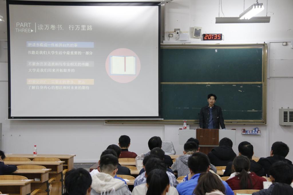 于06206教室开展了“善说之学长说”优秀学子经验分享会。学院学生会主席、2016-2017学年度欣羽奖学金获得者苏耀杰同学受邀为学院17级全体同学做了精彩的经验分享报告。