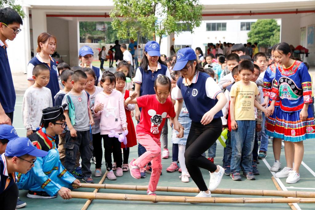 趣味课堂结束后,志愿者们带领同学们来到操场,与同学们手拉手一起跳竹竿舞,在舞蹈与音乐中感受广西特有的“三月三”壮乡民族风情,同时为同学们送上特殊的礼物。