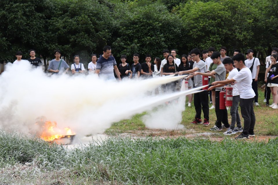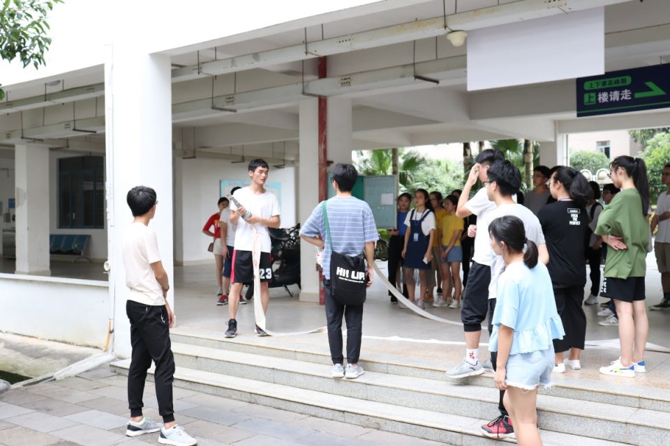 此次消防演练的内容包括:“模拟火情”,学生逃生;讲解灭火器消防栓知识以及实际操作;参观安全教育基地。逃生演练中,工作人员指挥同学们捂住口鼻,弯腰,迅速有序的沿楼梯通道快速撤离,到达指定集合点。接着,工作人员带领同学们到达六栋教学楼一楼,讲解消火栓设备水枪和水带的组装,以及如何对准火势进行喷水,宿舍长们也都积极尝试消火栓的使用。随后,工作人员在油菜花空地给同学们讲解了如何使用灭火器,并让每一位到场的同学都亲手使用了灭火器灭火。在最后,同学们参观了学校安全教育基地,并在现场学习了多项安全知识。