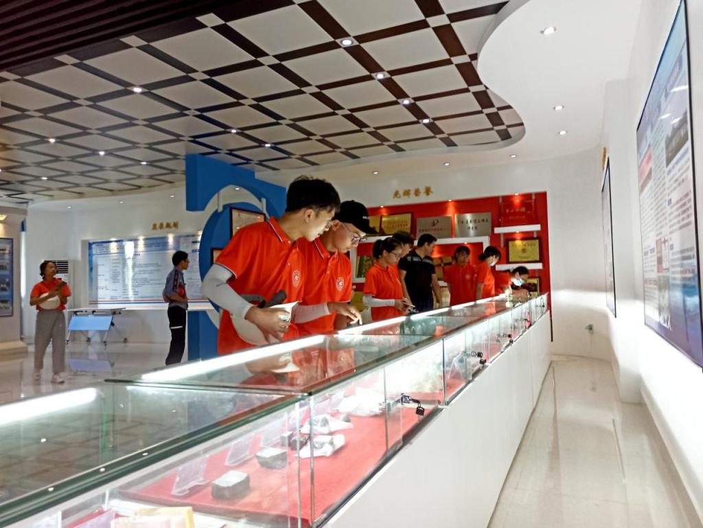 (实践人员参观展厅,观看工口漫画背景和提取稀土中金属元素获得的产品)
