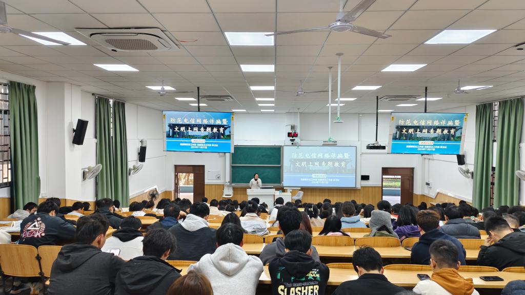 在雁山校区5栋05102教室召开研究生防范电信网络诈骗暨文明上网专题教育大会。大会由研究生辅导员马亚博老师主讲,学院全体2024级研究生参加。