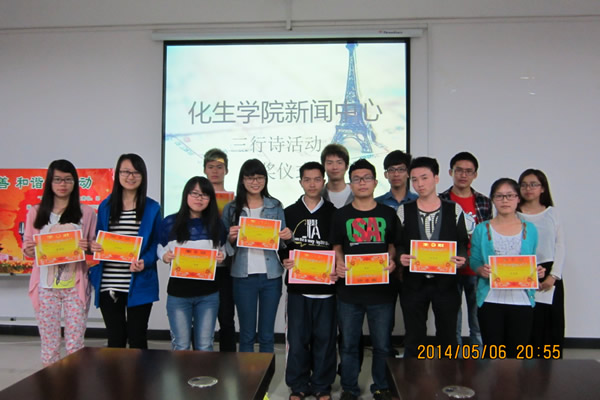 党委副书记陶剑飞老师、13级辅导员陈文甫老师出席了颁奖仪式。两位老师对 “三行诗”主题文化活动的效果和意义表示了充分的肯定,并祝贺了获奖的同学,希望同学们以后可以继续发挥自己的特长,创造出更多优秀的作品,丰富校园文化生活。其次,晚会对优秀的获奖作品进行了展示,诙谐幽默、情感真挚的作品风格真切的表现出了同学们的才华。接着,老师给获奖的同学颁发了奖状和奖品。最后,获奖的同学以及工口漫画的成员们分别拍照留念,在热烈的掌声中,整个活动圆满结束。
