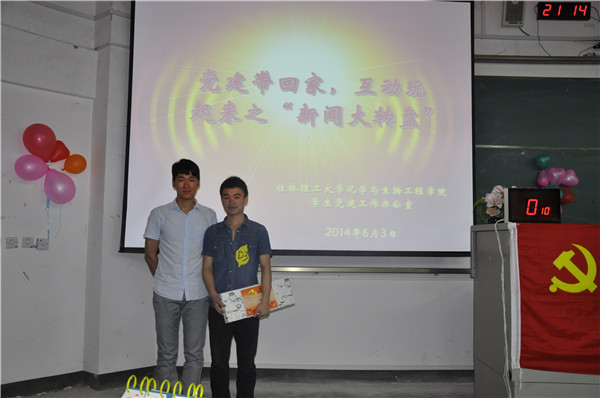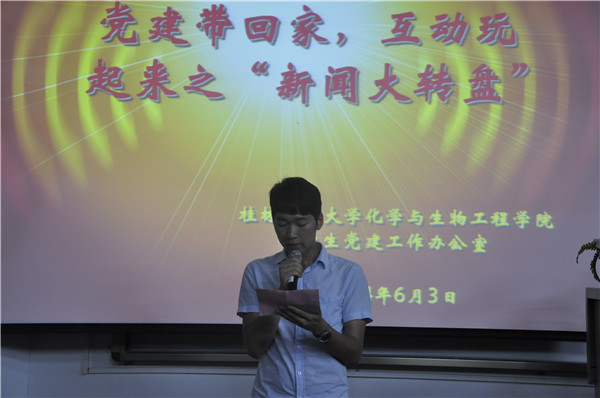 学生党建办公室主办的党建带回家,互动玩起来之“新闻大转盘”活动在雁山校区05101室举行。学生党建办公室主任何宗辉老师、工口漫画