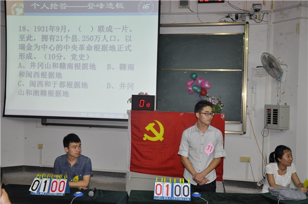 随后活动精彩进行,选手分为五个小组,每组以累积计分的形式比赛,比赛共有必答题、抢答题、决赛三个环节。活动期间,选手们幽默而又不失风采,掌声接连不断,在选手的精心准备和各环节激烈的角逐下气氛紧张而又激烈,最终,本科二支部的魏培贺同学过五关斩六将,以最高分获得冠军。
