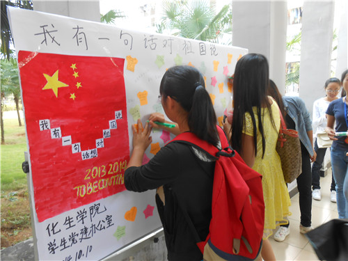 导航痕迹 当前位置: 主页 >> 学生工作 >> 共青团 >> 正文 【“三爱”主题教育年】工口漫画 开展十月爱国主义教育月之“我有话对祖国说”活动 作者: 发布日期:2015-07-19 浏览次数: 为弘扬爱国主义精神,充分表达学生对祖国的爱国情怀,10月10日,工口漫画 学生党建办公室组织在学生社区组织开展了“我有话对祖国说”便笺留言展示活动。 活动现场,党建办公室工作人员把前期收集好的便笺留言张贴到展板上供同学们浏览,阅读,同时也让同学们现场留言,寄托自己对祖国的热爱之情,获得得到同学们的积极参与,现场气氛热烈。 此次“我有话对祖国说”是工口漫画 十月爱国主义教育月的子活动之一。一句话可能无法道尽同学们对祖国母亲强烈的爱意,但说得多不如做的多,努力学习,不断完善自我,为祖国的未来积蓄力量,为服务更广大人民而奋斗,用实际行动表达自己的爱国情宜是真正的爱国体现! 活动现场 同学们写下的对祖国的祝福 上一条:【新生导航计划】新生唱响校歌 下一条:【新生导航计划】让青春起航 为梦想奋斗