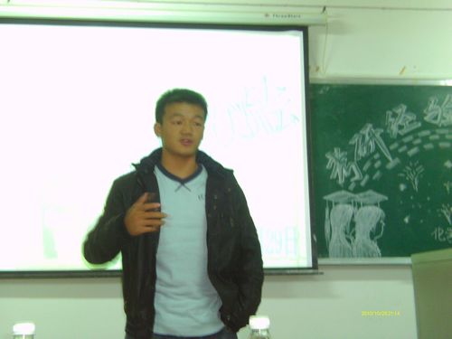首先,由研一同学代表戴建针对考研动机,考研目标,考研方法,以及考研注意事项等四方面给同学们做了详细的介绍,分享了他自己在准备考研过程中的许多宝贵经验。他细致的谈论到考研不仅要靠先天的条件,更重要的是有吃苦耐劳,坚持不懈的精神,要在这过程中学会享受考研准备过程中的那份孤独。而考研方法“符合自己的才是最好的”,其中熟能生巧,举一反三,灵活运用等三个步骤很值得我们借鉴。学习过程中做好计划,充分利用时间,总结回顾,有针对性地做专题等,能在考研过程中起到很好的作用。戴建同学的发言为台下准备考研的同学拨开了层层迷雾,和同学们在复习过程中的经验形成共鸣。其他研究生代表也根据自己的经验介绍了在考研过程中注意的事项。在接下来的自由提问环节,到会的研究生代表积极回答同学们对于考研过程中的跨省,跨专业考研,以及专业课等问题,给提问的同学进行了详细的解答,从而赢得阵阵掌声。