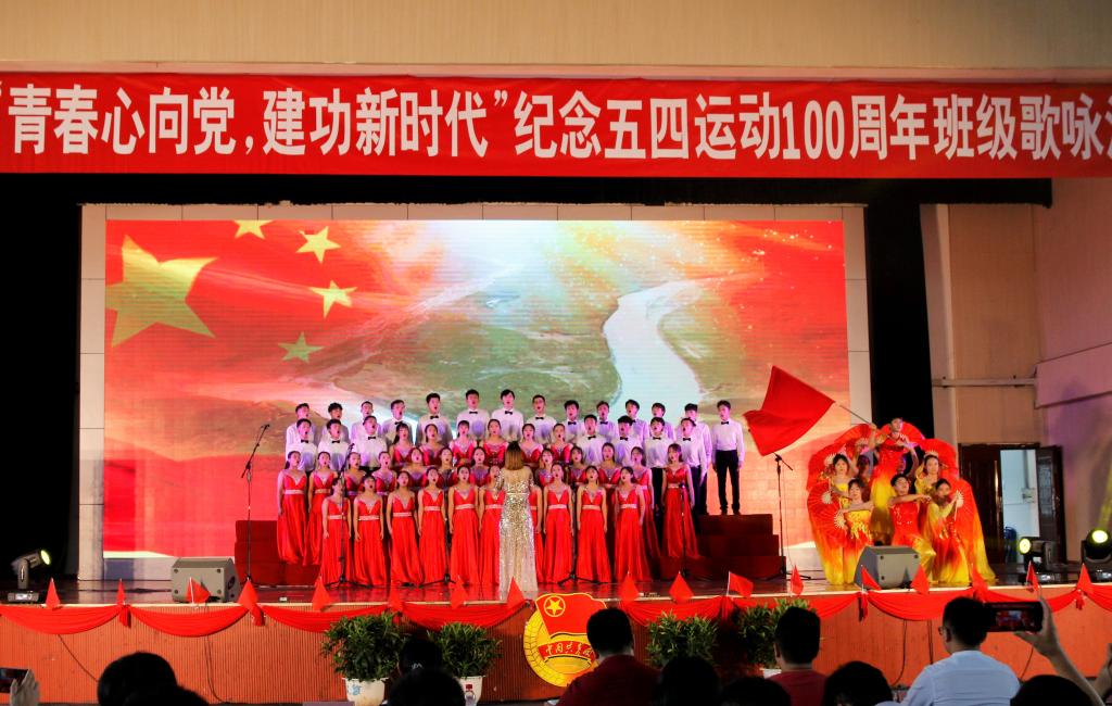 参赛队伍第五个出场,队员们身着靓丽的服装,迈着整齐的步伐,斗志昂扬的走向舞台的中央。随着伴奏的响起,队员们用一首《在灿烂的阳光下》,讲述了中国共产党领导全国人民走过的风雨历程。“从小爷爷对我说,吃水不忘挖井人,曾经苦难才明白,没有共产党哪有新中国……”歌声时而悠扬低沉,时而高亢激昂,将曲目所要表达对祖国的热爱与赞颂表现得淋漓尽致。学院参赛队伍精彩的演绎,赢得了台下评委与观众雷鸣般的掌声,最终以90.8分的成绩获得三等奖。