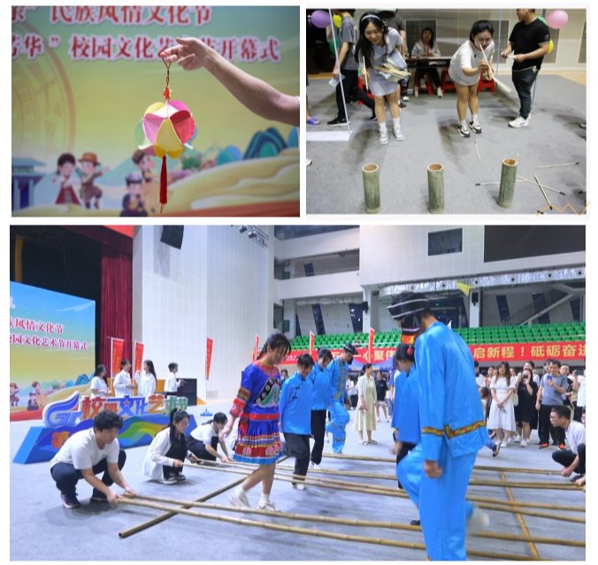 开幕仪式后举行了民族风情主题游园活动。民族服饰换装展示、竹竿舞、滚铁环、板鞋竞速、抛绣球等15项具有少数民族特色的互动体验活动同时开展,形式灵活多样、内容丰富多彩,吸引了在场师生的热情参与。