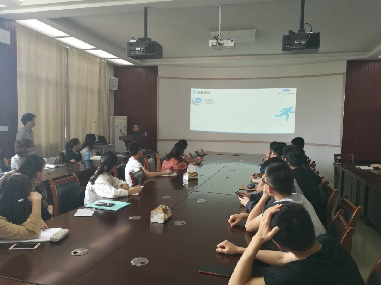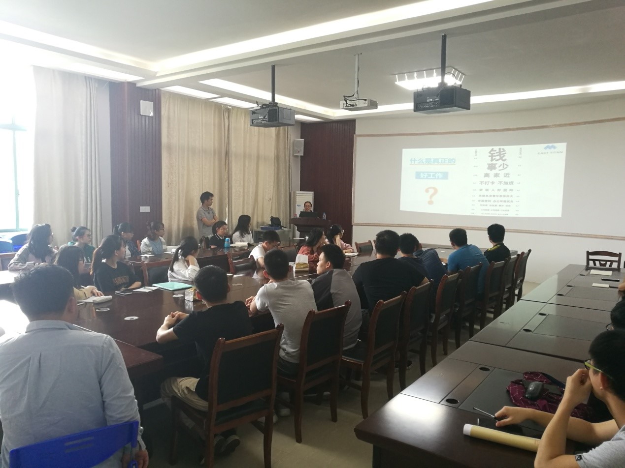 招聘会现场,防城港市东途矿产检测有限公司代表对其公司做了简单的介绍。接着,企业代表从公司概况、仪器设备、组织构架、招聘要求、福利待遇、岗位职责等方面做了详细的讲解,随后对同学提出的问题进行了相应的解答。最后有意向的大三同学留下了进行了简单的笔试和面试,研究生直接进行了面试。