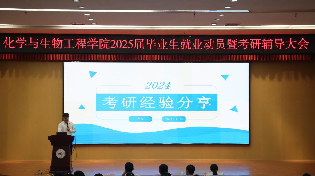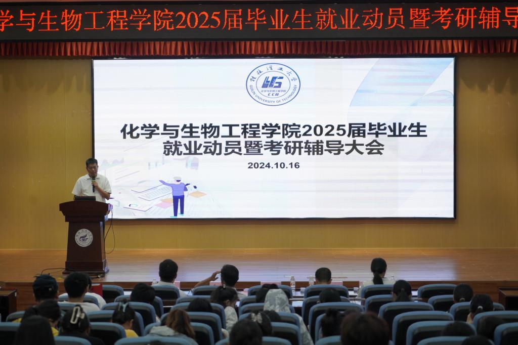 10月16日中午,学院在雁山校区图书馆报告厅召开了2025届毕业生就业动员暨考研辅导大会。学院党委书记彭代江,院长匡小军,党委副书记李少华,副院长李霞、何方、孔翔飞出席,2021级辅导员陈千癸、2024届优秀毕业生苏宸及2025届本科生参加。