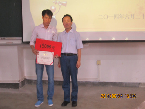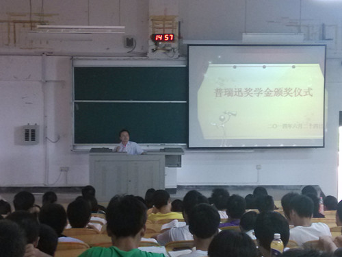 普瑞迅奖学金条例》,第二项议程由杨建文副院长为获奖的化工10-1班兰海宽同学颁奖。随后兰海宽同学为大家介绍了普瑞迅公司的情况以及获得奖助学金的感言,并对低年级同学的提问一一作答。最后一项议程是由杨建文副院长做电化学专业发展介绍,为12,13级的学生讲解了他们的就业前景和方向。此次活动的举行,进一步巩固了优秀学生典型对同学们的示范和引导作用,充分激发了同学们学习的积极性、主动性、创造性,并使电化学方向学生了解了专业特色和明确自身发展方向。 杨建文副院长为学生颁奖