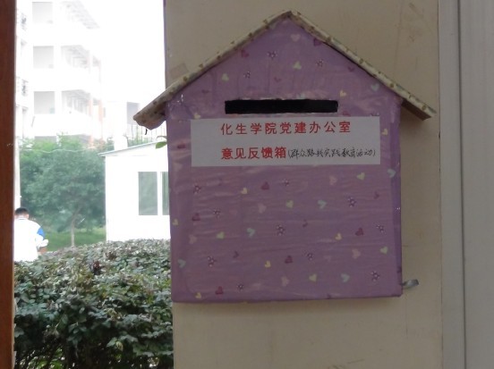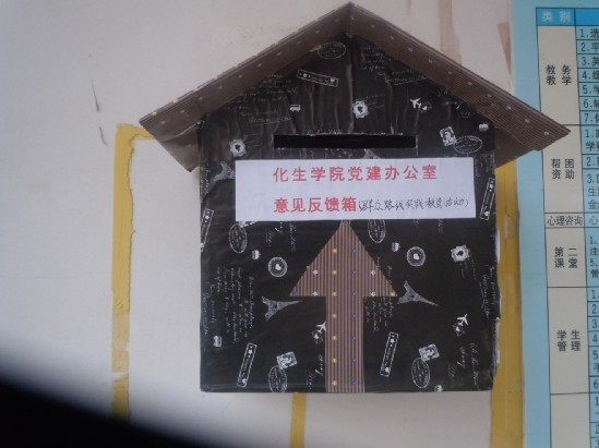 导航痕迹 当前位置: 主页 >> 新闻资讯 >> 工口漫画新闻 >> 正文 【群众路线教育实践】 化生学院设立党的群众路线教育实践活动征求意见箱 作者: 发布日期:2013-10-31 浏览次数: 为切实推进工口漫画 党的群众路线教育实践活动,推动工口漫画 各项工作科学发展,进一步落实密切联系同学、服务同学的工作机制:坚持服务于同学、问需于同学、问计于同学,切实做到知同学情、解同学忧、暖同学心。本着“畅所欲言,集思广益”的原则,10月22日,工口漫画 学生党建工作办公室在雁山校区12210学院学工办门口、女生宿舍4A一楼楼下公布栏、男生宿舍7#一楼楼下公布栏分别设立了意见反馈箱以及设立专用电子信箱账号:[email protected] 。面向全院广泛征求党员和群众的意见和建议。同学们可以以信件、便条及邮件的形式,从生活,学习,工作等方面,就学校管理工作和有关学校发展的各类问题提出意见和建议。意见箱收集的意见,建议和反映的问题,将由工口漫画 学生党建工作办公室安排专人管理,定期收集、整理意见信息,并分类向相应部门和有关学校领导反映,切实做到民心所向,把同学们的真实想法如如实实的反映出来。相信通过设立学生意见箱,能进一步了解同学们的心声,实现密切联系同学,服务同学,使同学得到更多实惠这一目的。同时也将拓宽同学们和学校之间的沟通渠道,充分发挥舆论监督作用,强化同学们的主人翁责任意识,调动同学们参与学校教育教学、管理服务工作的积极性,为学校发展献计献策。 女生宿舍4A一楼设立的意见反馈箱学院学生工作办公室门口设立的意见反馈箱男生宿舍7#设立的意见反馈箱 上一条:工口漫画 教师参加第十七届中国化学会有机与生物分析研讨会 下一条:喜讯:我校学子在广西高校大学生化学实验技能竞赛中喜获佳绩