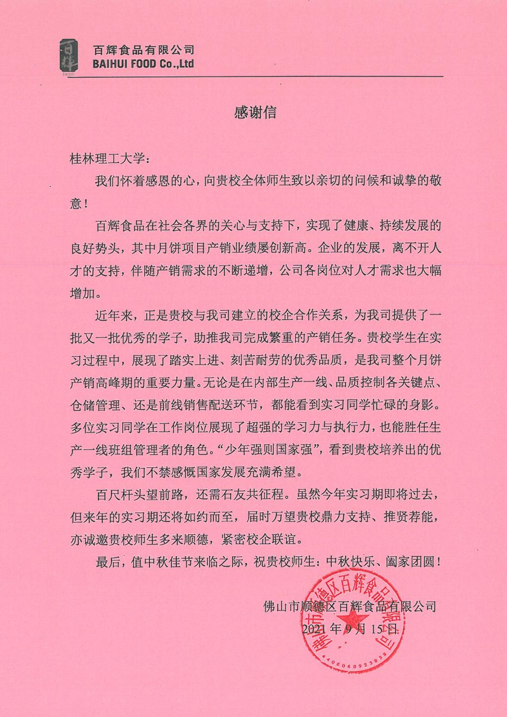 信中提到,公司自与学校建立校企合作关系以来,已经为公司提供了大量品学兼优的实习学生,对我们的学生的素质、能力和综合素质给予了肯定,学生们充分展现了踏实上进、刻苦耐劳的优秀品质,在不同岗位上,发挥了超强的岗位学习能力、执行力和组织管理能力,学生们的优秀表现获得了公司上下一致认可。百辉食品有限公司期待继续获得学校的鼎力支持、推荐贤能。
