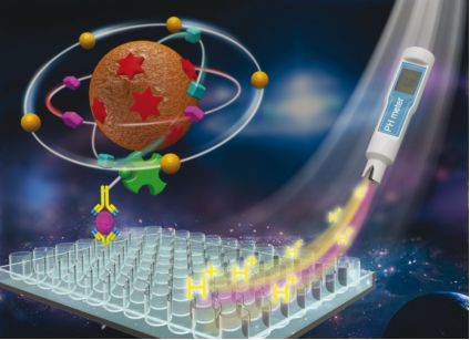 的张云副教授研究小组提出了一种基于pH量测机制的简单、经济、灵敏、特异、便携式的ELISA新方法。该法首先通过在酶标板中进行抗原-抗体特异性免疫反应,捕获样品中分析物抗原或抗体;进而引入葡萄糖氧化酶修饰磁性微珠用于高效信号放大;最后采用廉价的笔式pH计量测葡萄糖氧化酶催化葡萄糖底物所得混合溶液pH值,以实现分析信号的低成本定量读取。