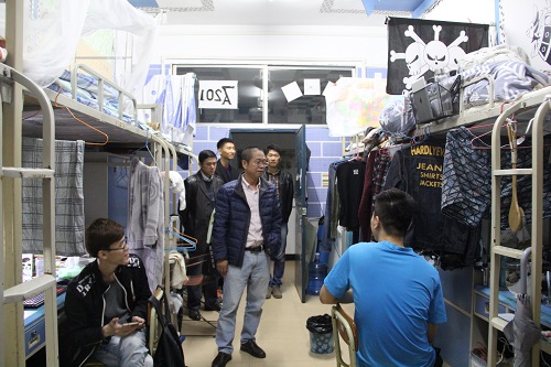 大三大四男生宿舍检查。走访宿舍期间,梁书记及李院长一方面关心,关注同学们的生活、学习状况,另一方面对学习不积极的同学,特别是对在宿舍玩游戏的同学进行了严厉的批评。梁书记还告诫同学们要保持宿舍整洁卫生,营造一个和谐良好的宿舍生活学习氛围,同时在大学期间要少玩游戏,多参加集体,加强体育锻炼,达到德智体美劳全面发展。