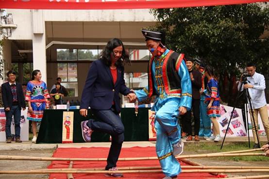 “咚咚咚…”同学们的注意力被这强节奏感的敲打声吸引而去,只见几名同学拿着竹竿作有节奏的敲打,然后身着壮族服饰的姑娘们在上面跳。这又是壮族另一项特色运动——过竹竿阵。在壮族姑娘和小伙的带领下,老师们也上去体验了花式过竹竿阵。步子的节拍与竹竿打击响声同步,旋转跳跃,简单的动作却又不简单的通过,让参与者切身体会到了壮乡特色运动的魅力。紧接着,到了最后一个项目——三人滑板竞速。这是一个团队合作的项目,合作方式是三人站作一队,三个人的左右脚共同踏在一块滑板上,考验三人组的团队合作及协同能力,活动过程中同学们参与积极,老师们也按耐不住和同学“切磋”了几局。