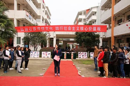 活动伊始,陶剑飞老师为活动致辞。她说道:壮族传统文化是壮族人民在长期的社会历史实践中而形成的,具有较强的稳定性、持久性、传承性和顽强的生命力的精神财富,“三月三”是我们广西壮族独特的民族传统文化节日,我们应该立足民族优秀传统文化,培育和弘扬社会主义核心价值观。同时向同学们提出了三点希望:一是希望广大同学要传承创新,充分认识“弘扬壮族传统文化,践行社会主义核心价值观”系列活动的重要意义;二是希望广大同学继承先贤,做好“文化传播使者”;三是希望广大同学要崇德重德,将社会主义核心价值观和民族文化传统落实到日常学习生活中去。