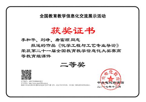 教师李和平、刘峥、唐富顺的作品“《化学工程与工艺专业导论》多媒体课件”在第二十一届全国教育教学信息化大奖赛中荣获高等教育组课件二等奖。