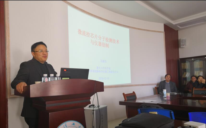 报告会中,孔继烈教授首先介绍了微流控的相关基本理论——将各种基本操作单元(制备、反应、分离、检测)集成到一块几平方厘米的芯片,由微通道形成网络,可控流体贯穿整个系统。微流控从20世纪六、七十年代被提出以来,在分析化学、微电子微光学、计算机科学、微电子加工、生物医学以及材料学(表面修饰、化学改性)等领域有着广泛应用。孔继烈教授重点介绍了微流控在病原体的筛选(高通量、准确、快速检测,例如:SARS)、高敏高特异分子诊断(例如:HIV)、多靶标的甄别筛查(例如:禽流感)、单细胞核酸检测等不同研究方向亟待解决的难题。孔教授还简要总结了近几十年来该领域芯片的研发与应用成果,并展望了其发展趋势,分析了所面临机遇与挑战等。孔教授在报告会中还现场展示了他的团队正在研发的微流控应用产品,使听众们有了更直观的感受,同时加深了大家对此报告的印象。