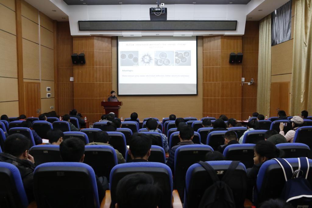 报告会上,潘安强教授向与会师生介绍了高容量电极材料优化设计的社会背景,从锂离子电池的性能与材料的密切关系指出改进电池材料及其优化设计的必要性,向大家介绍高容量硫族化合物负极材料及纤维材料的优势,并生动的展示了双金属硫化物作为钠离子电池高性能负极材料的研究成果。此外,潘安强教授还就科研思维的培养与师生们进行了交流。