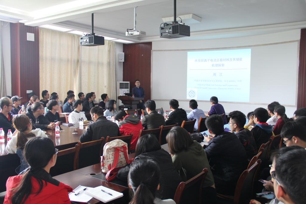 邀请,2019年3月28日下午,中南大学特聘教授周江在雁山校区12217多功能室作了题为“水系锌离子电池正极材料及其储能机理探索”的学术报告。我校相关专业师生聆听了此次报告。