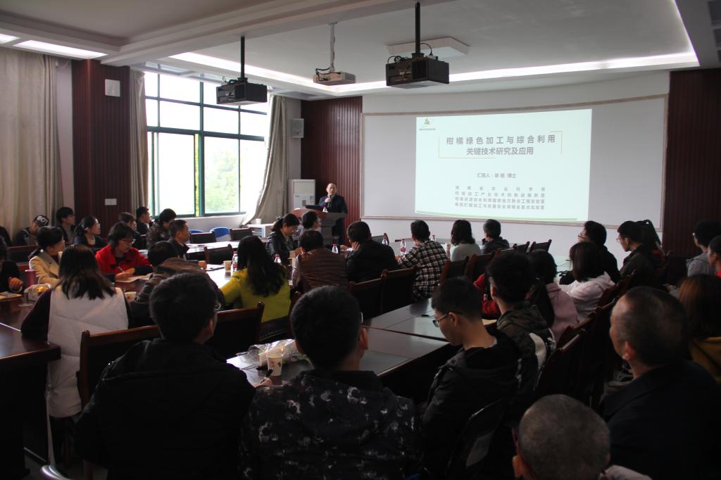 在报告中,单杨研究员介绍了我国柑橘产业的发展现状以及柑橘绿色加工和综合利用存在的技术瓶颈。他详细讲解了其研究团队在柑橘酶法脱囊衣、柑橘罐头绿色加工、柑橘副产物综合利用以及柑橘加工原料绿色贮(冻)藏等方面的创新研究成果与推广应用的情况。在互动环节,单研究员对师生们提出的问题一一作了详细解答。