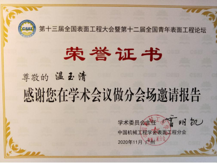 教师温玉清和尚伟带领研究生蒋世权、吴方、李姣姣、李永钊参加了本次盛会,其中温玉清老师做了题为“蜂窝状超疏水耐腐蚀自组装复合膜的制备及性能研究”的分会场邀请报告,研究生吴方等人张贴墙报1张。通过本次会议的交流和学习,使我们对表面工程的最新研究动态有了更深入的了解,拓宽研究思路和视野,相信这将对我们今后的教学和研究工作起到很好的促进作用。