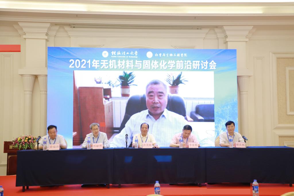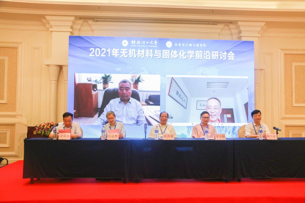 具体承办的“2021年无机材料与固体化学前沿研讨会”开幕式在桂林举行。本次会议主席、中国科学院院士、吉林大学冯守华教授(线上出席),中国科学院院士、中国科学院福建物质结构研究所洪茂椿研究员,中国科学院院士、清华大学李亚栋教授,中国科学院院士、中山大学陈小明教授(线上出席),教育部长江学者特聘教授、北京科技大学邢献然教授出席,学校校长解庆林教授出席并致辞,学校副校长梁福沛教授出席并主持开幕式。来自全国50多所高校、科研院所的180多名代表参加本次研讨会。