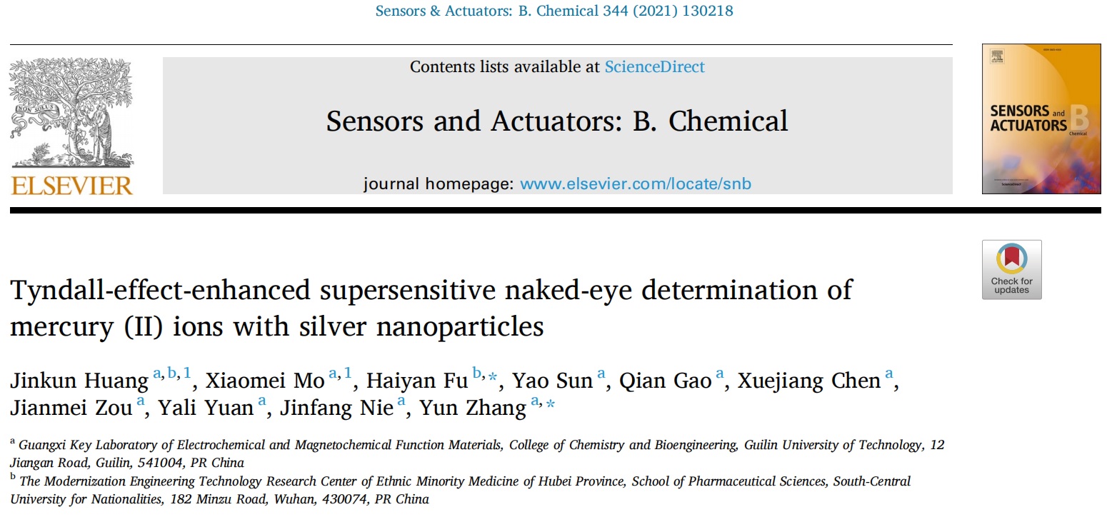 张云教授课题组和中南民族大学付海燕教授课题组合作,在即时检测(Point-of-care testing,POCT)研究领域再次取得重要进展。相关成果以“Tyndall-effect-enhanced supersensitive naked-eye determination of mercury (II) ions with silver nanoparticles”为题发表在化学与生物传感领域国际著名期刊Sensors and Actuators B: Chemical(SCI一区TOP,影响因子为7.10)上。该项研究得到国家自然科学基金面上项目、广西杰出青年基金、中央引导地方科技发展资金、广西重点研发计划等项目资助。工口漫画