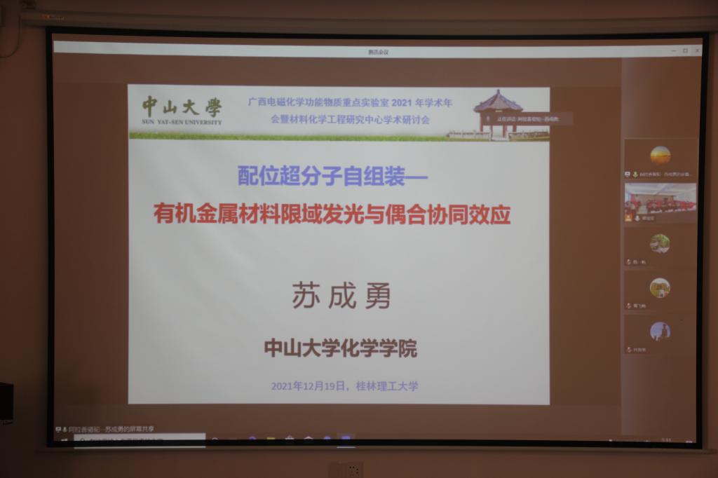 会议采取线上+线下的方式进行。在线上报告中,黄飞鹤教授、叶邦策教授、苏成勇教授、王双印教授、韩一帆教授重点介绍了他们近期在化学与材料科学领域取得的优秀成果以及国家自然科学基金申报过程的相关经验。广西电磁化学功能物质重点实验室、材料化学工程研究中心的部分骨干教师:周立教授、陈秀丽教授、李义兵教授、尹从岭教授在现场作报告,主要介绍了他们在化学、材料科学交叉领域的科研工作进展情况;甄士杰副研究员、李世清副教授、海杰峰副教授、刘博天副研究员、刘光艳博士介绍了他们在电、磁化学功能物质的创制与应用领域等方面取得的进展情况,何方研究员分享了其申报国家自然科学基金的丰富经验。本次会议报告涉及领域广泛,内容丰富,讲解深入浅出,使大家拓宽了学术视野,取得了良好交流效果,对推动学院科研交叉融合和学科建设取得更好成绩起到了积极作用。