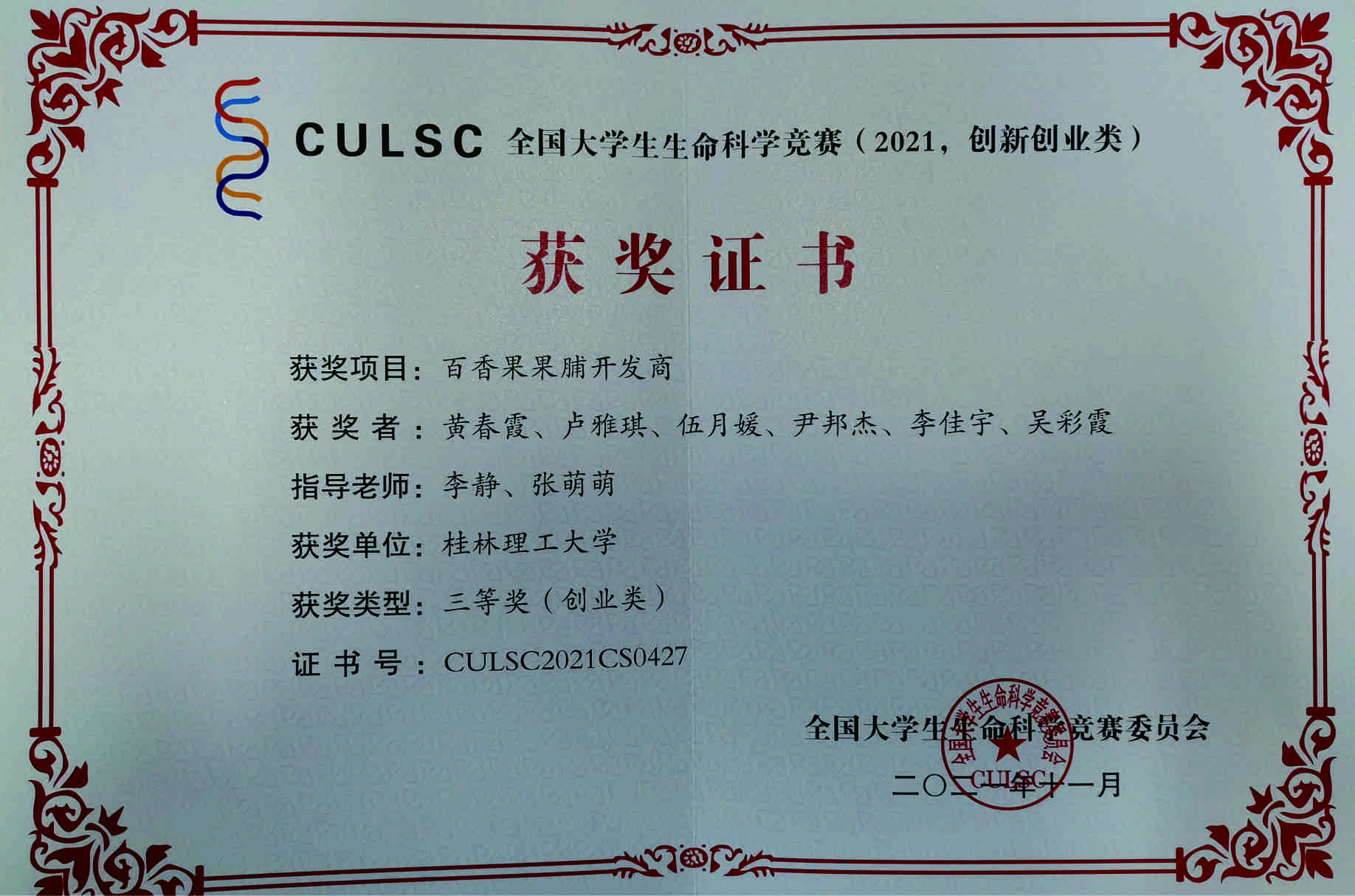 创新创业类作品《百香果果脯开发商》获奖证书