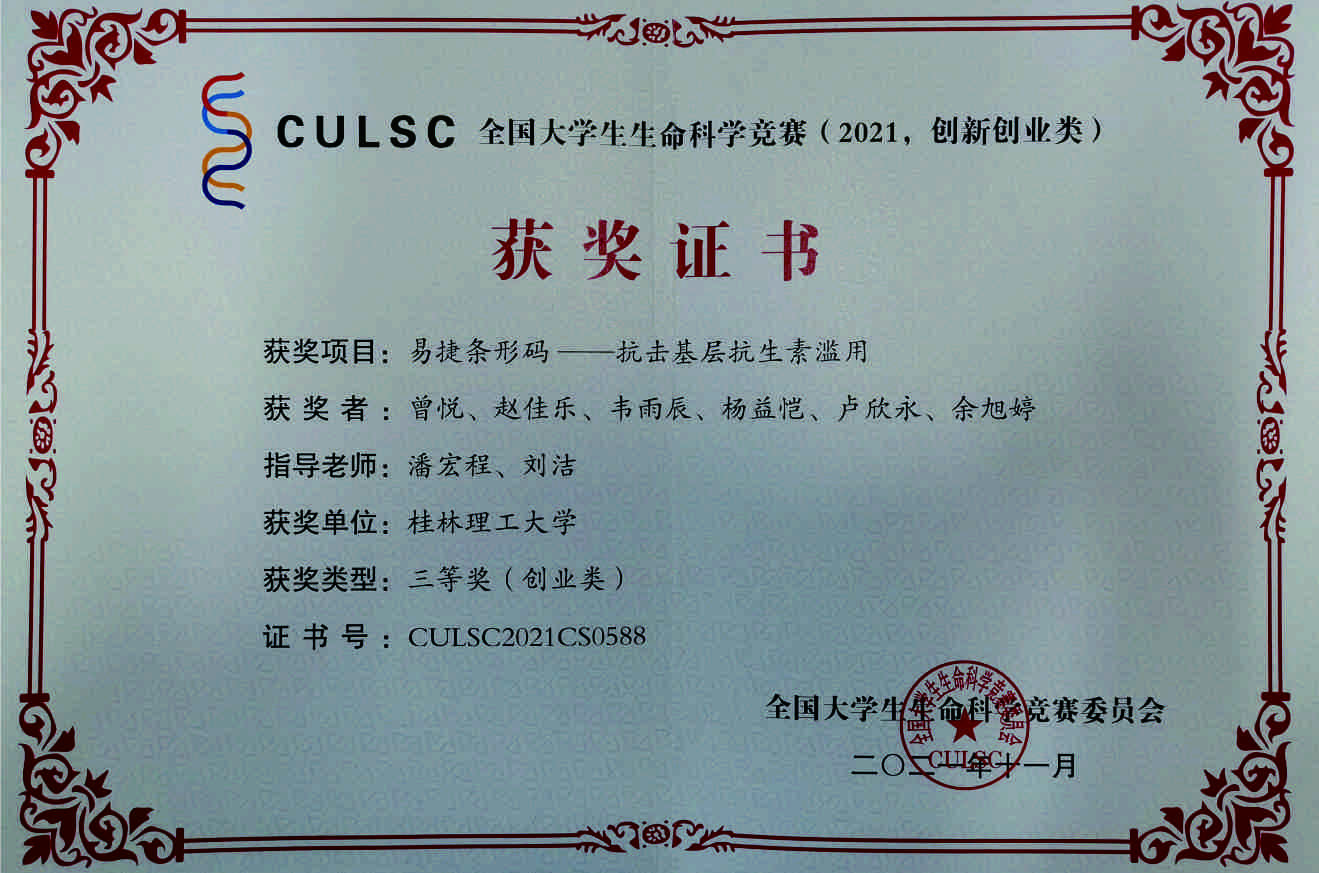 创新创业类作品《易捷条形码——抗击基层抗生素滥用》获奖证书