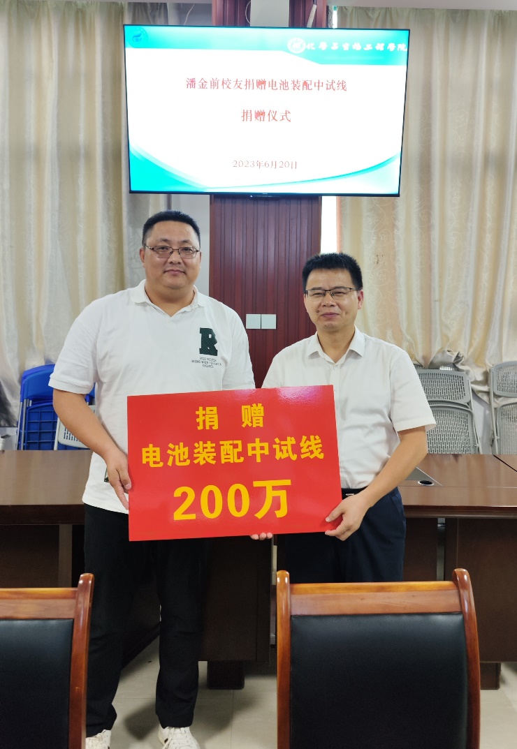 随后,匡小军院长与潘金前总经理共同签署了《共建“新能源动力电池现代产业学院”合作协议》,潘金前总经理向我校“新能源动力电池现代产业学院”捐赠了价值200万元的电池装配中试线一套。最后,双方围绕产业学院的人才培养、产学研合作方面开展了深入的座谈交流。