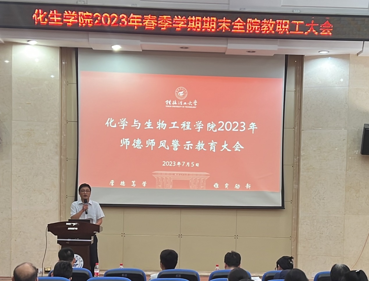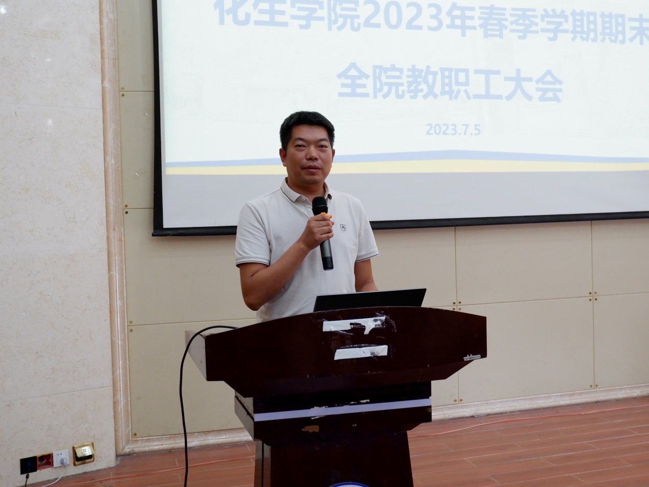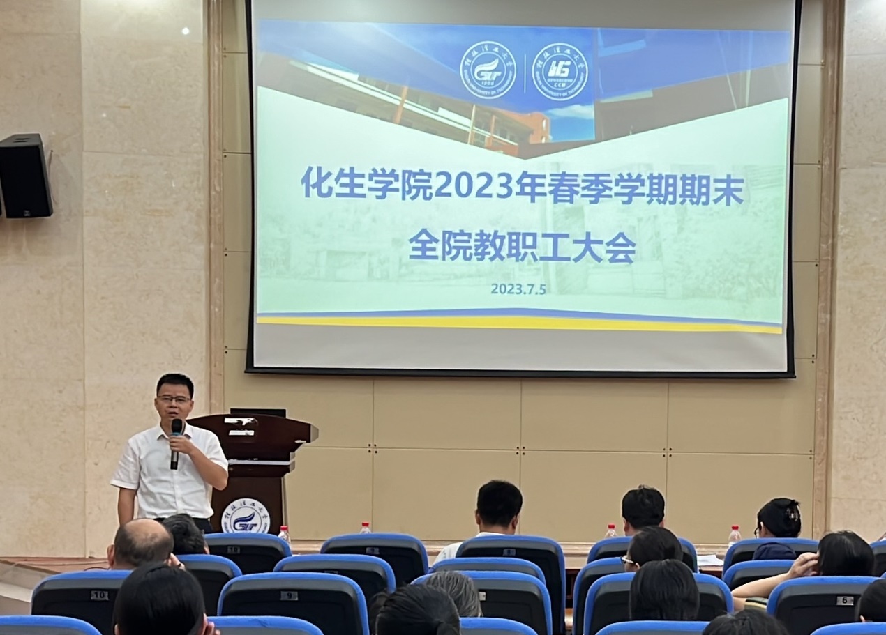 在雁山校区萃华楼报告厅召开2023年春季学期期末全院教职工大会,学院全体教职工参加。会议由学院院长匡小军主持。