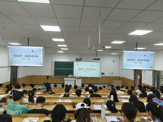 在05307教室举办了“四级写作、翻译专项讲座”。此次讲座由外国语学院资深教师莫娜主讲,学院150余名本科生聆听了讲座。