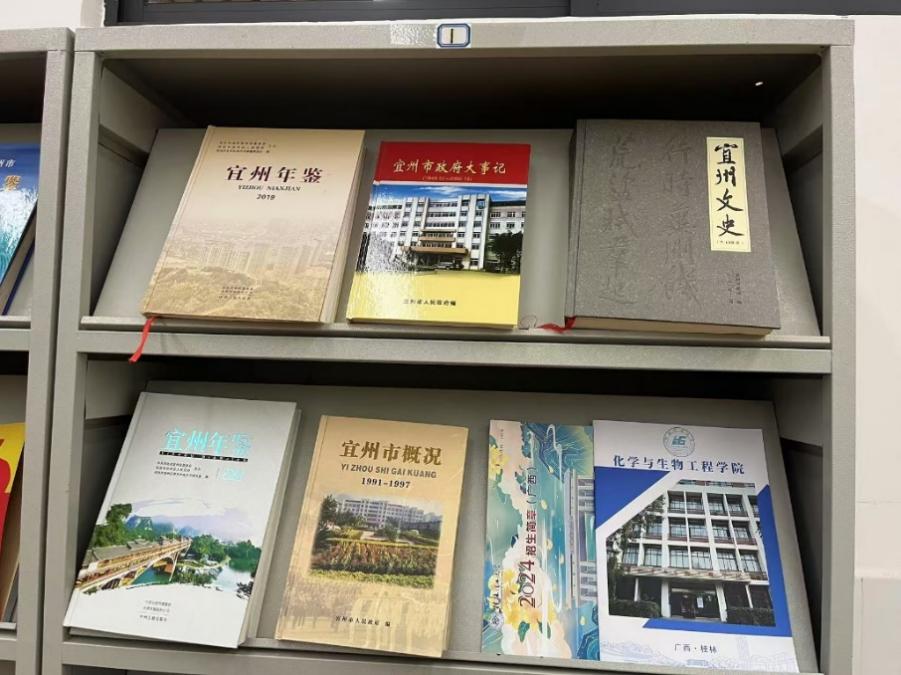 图一 宜州区高级中学万众读书楼宣传架上,我校的招生宣传资料