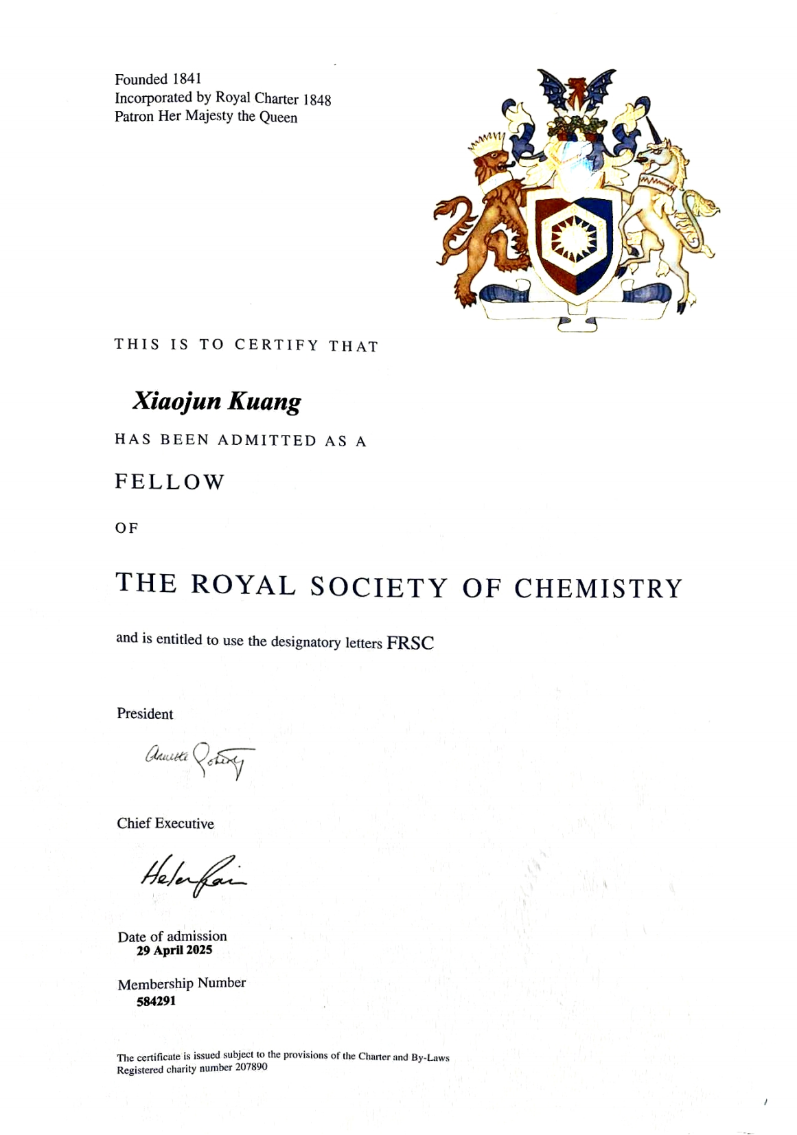 匡小军教授当选英国皇家化学会会士(Fellow of the Royal Society of Chemistry, FRSC)。