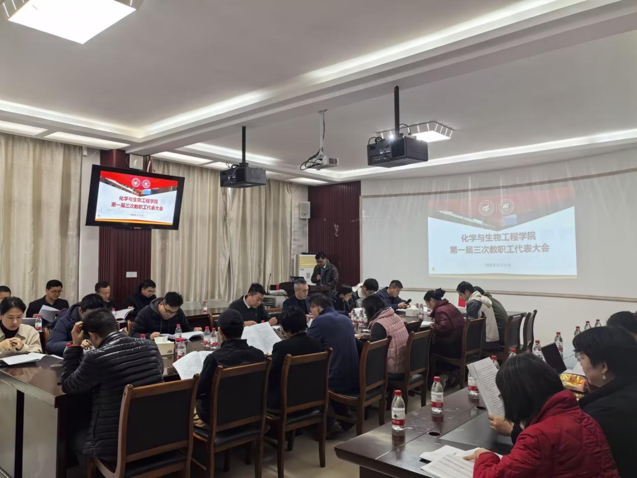12月12日下午,化学与生物工程学院顺利召开第一届三次教职工代表大会。本次大会以习近平新时代中国特色社会主义思想为指导,深入贯彻党的二十大和二十届四中全会精神,学习贯彻学校第四次党代会精神,全面总结学院2025年各项工作成效,系统谋划2026年发展蓝图。学院党政领导班子成员、全体教职工代表齐聚一堂,共商学院发展大计。会议由学院党委副书记、纪委书记李少华主持。