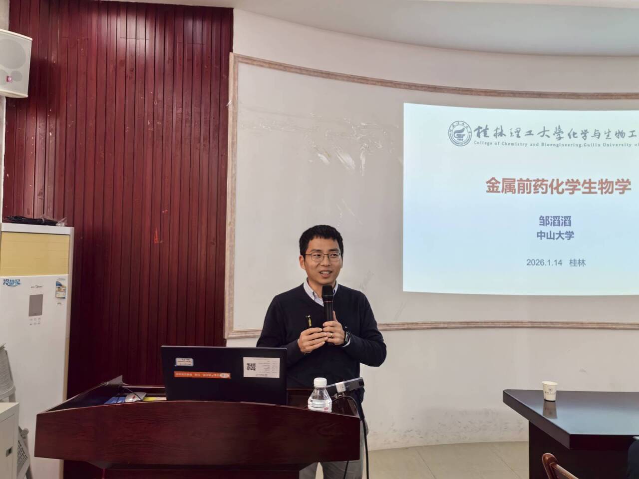 邀请,在我校雁山校区萃华楼217室作题为《金属前药化学生物学》的学术报告。报告会由梁福沛教授主持,近百名师生现场参加。